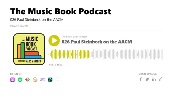 Paul Steinbeck is an associate professor of music at Washington University in St. Louis. He has written extensively about the Association for the Advancement of Creative Musicians (AACM), the Art Ensemble of Chicago, Anthony Braxton, and Fred Anderson. Steinbeck’s book Sound Experiments, a study of ten influential pieces by AACM composers, is published by the University of Chicago Press (2022). His previous book Message to Our Folks, a history of the Art Ensemble, is available in English from the University of Chicago Press (2017), in Italian from Edizioni Quodlibet (2018), and in French from the Presses Universitaires du Midi (2021). With Fred Anderson, Steinbeck is co-author of Exercises for the Creative Musician (2002/2010), a method book for improvisers.
